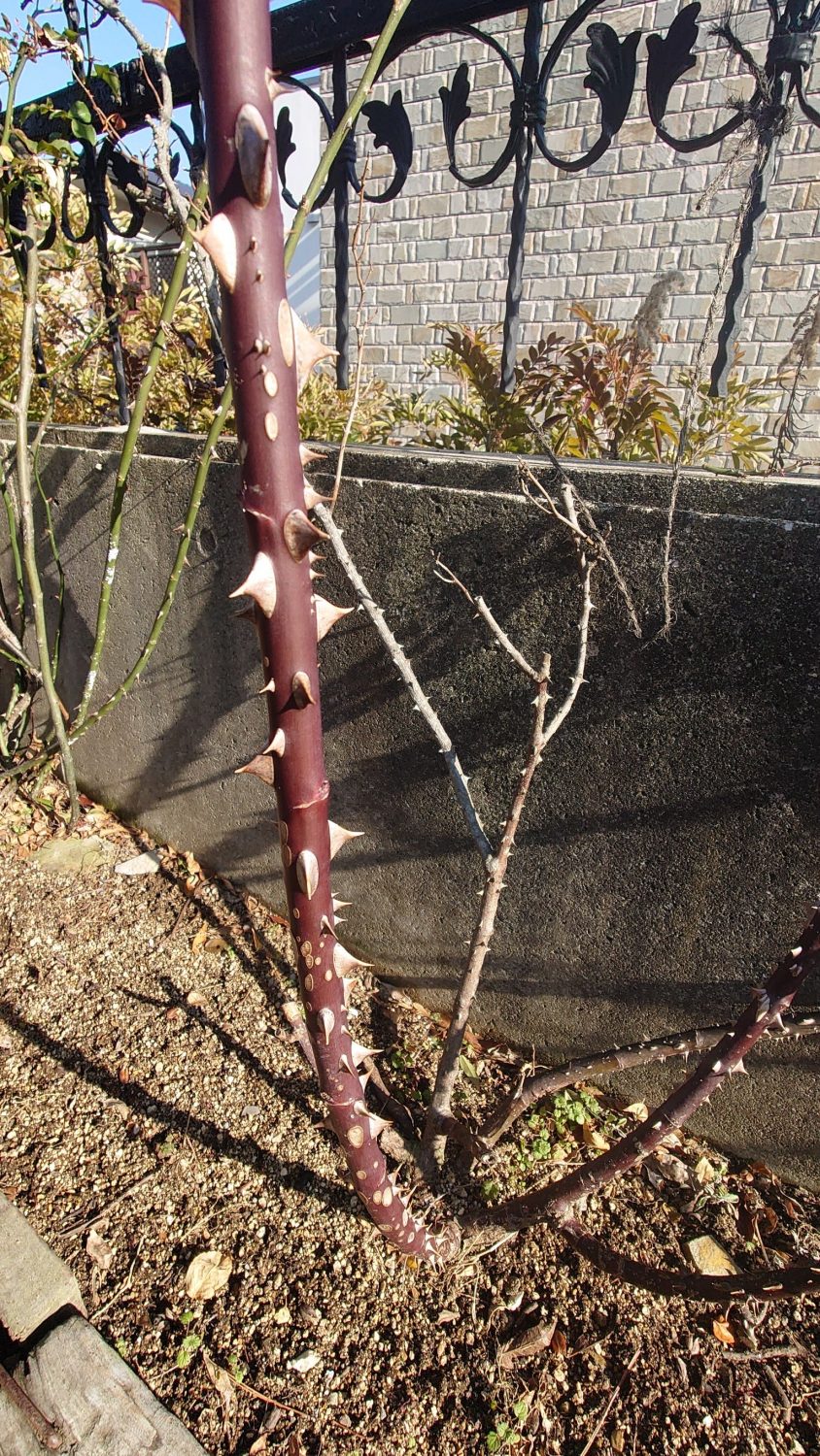 ちなみに・・・↓超多花性のつるバラ・ダブリンベイの枝はこんな感じで棘だらけなので剪定の際には必ず革手袋をして作業しています♪